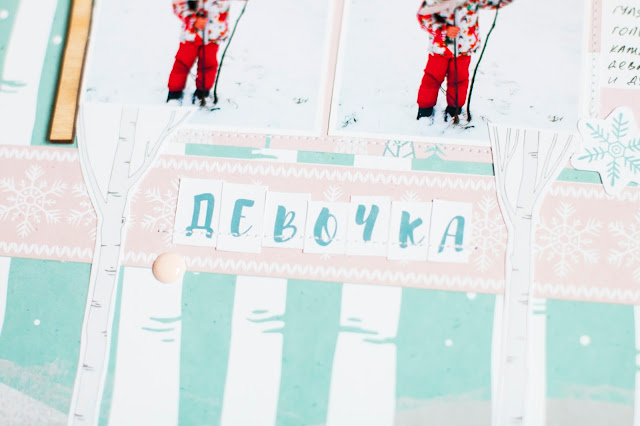 Спустя пару недель я получаю эту коллекцию, вижу лист с берёзками, и эти деревянные деревья с варежками. Всё, я не могла ничего делать, пока не собрала эту страничку, как идеально всё сошлось!